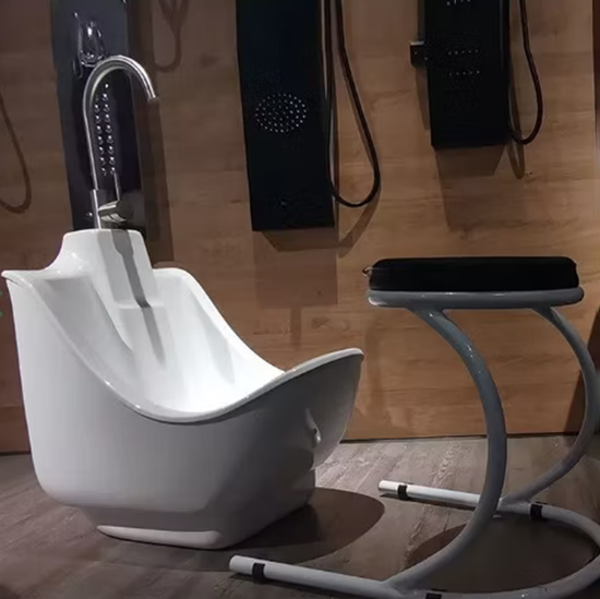 A thoughtfully designed foot washing station featuring a contoured basin with a dedicated faucet, ideal for performing ablutions (wudu) or personal hygiene routines with ease and comfort.